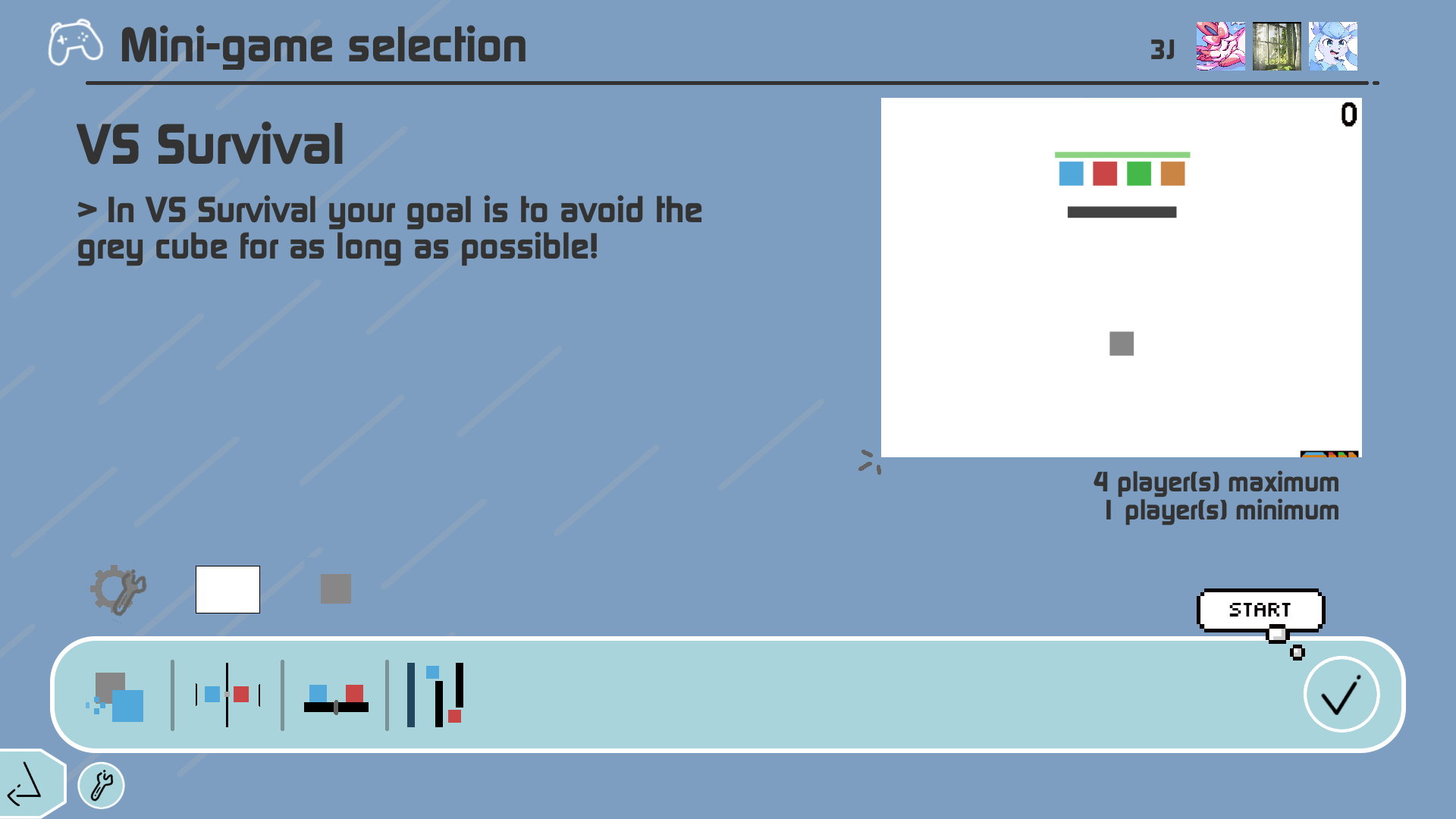 In VS Survival your goal is to avoid the grey cube for as long as possible!